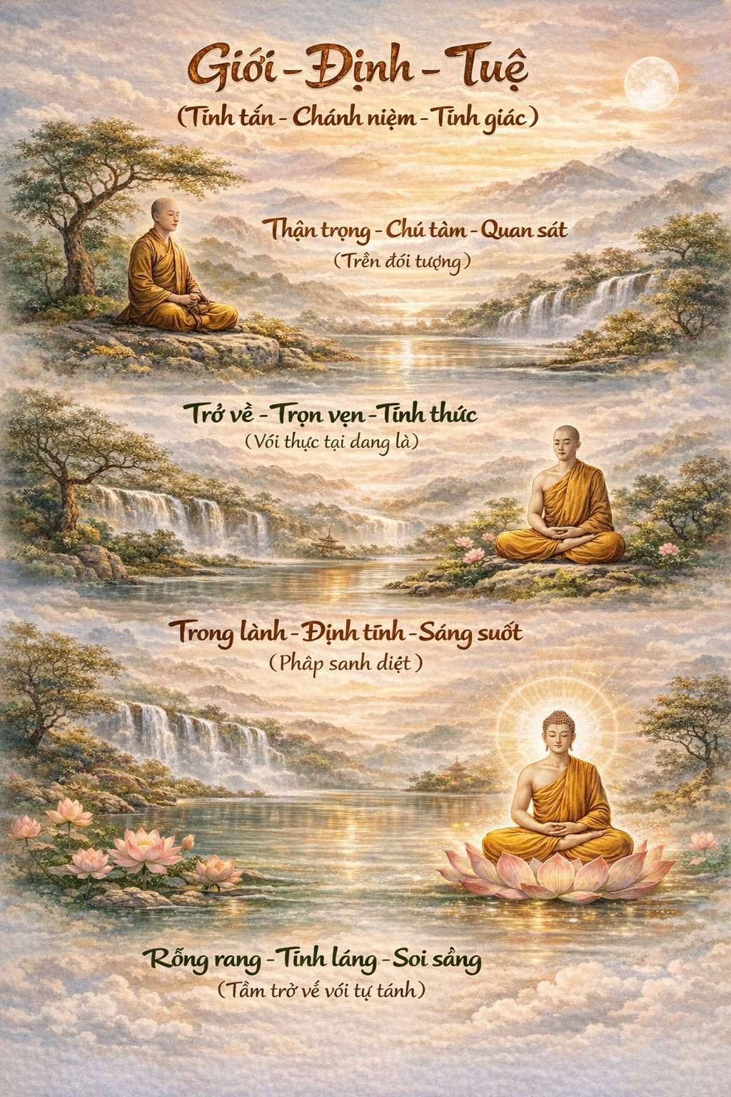 3) Khi mở ra đón nhận mọi sự đến đi tự nhiên hoặc đối tượng là toàn cảnh với cái nhìn toàn diện, không cần chú ý đến một đối tượng nào nhất định, thì tinh tấn chánh niệm tỉnh giác chính là sự trong lành (giới), định tĩnh (định), sáng suốt (tuệ) sẵn có trong tánh biết.